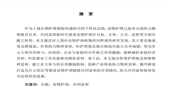 由财税与公共管理学院万谊娜副教授、王梦颖博士担任团队指导老师,社会保障专业研究生唐小洁、王栋、王雯雯、张小钰同学组建的参赛团队,利用暑假时间奔赴江西省上饶市开展实地调研,通过多次专题研讨,对参赛文本报告进行反复修改和完善,其参赛作品《亲情护理赋能共同富裕的路径探索——基于上饶市亲情护理的田野调查》,经专家匿名评审,获“全国大学生社会保障优秀调查报告与案例分析报告”征集活动优秀调查报告奖。团队受主办方邀请,拟于2022年12月10日参加首届“全国大学生社会保障优秀调查报告与案例分析报告”成果交流会,进行优秀成果交流分享。
